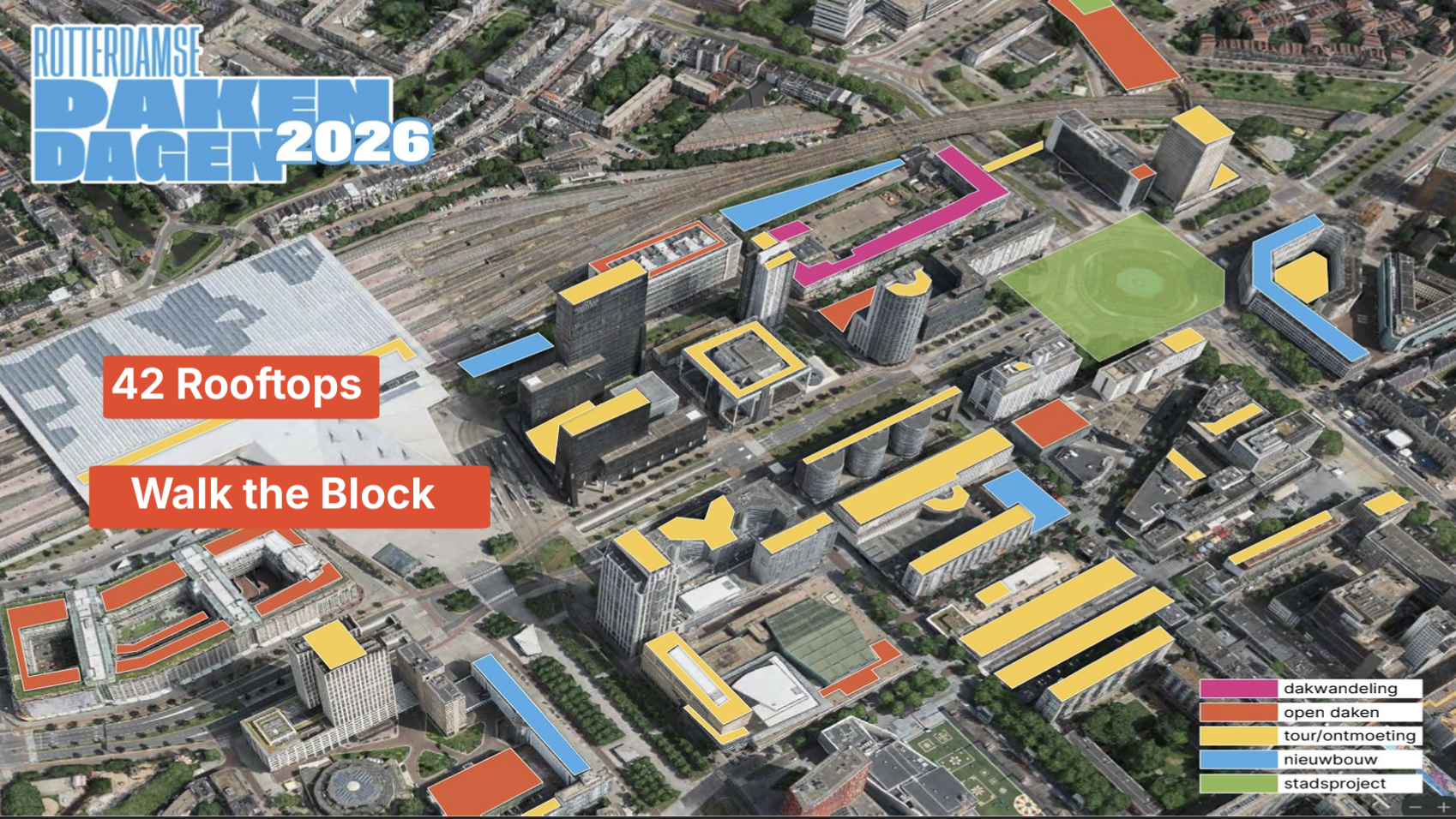 Rotterdam Rooftop Days - 42 rooftops, one neighborhood. For the 2026 edition, the Rotterdam Rooftop Days deliberately chose a compact area around Hofplein, Weena, and Stationsplein. It offers visitors a unique opportunity to see in the new city, we can still find space on the rooftops to make the city more fun, greener, and more sustainable. Find out more at: http://rotterdamsedakendagen.nl/en/
